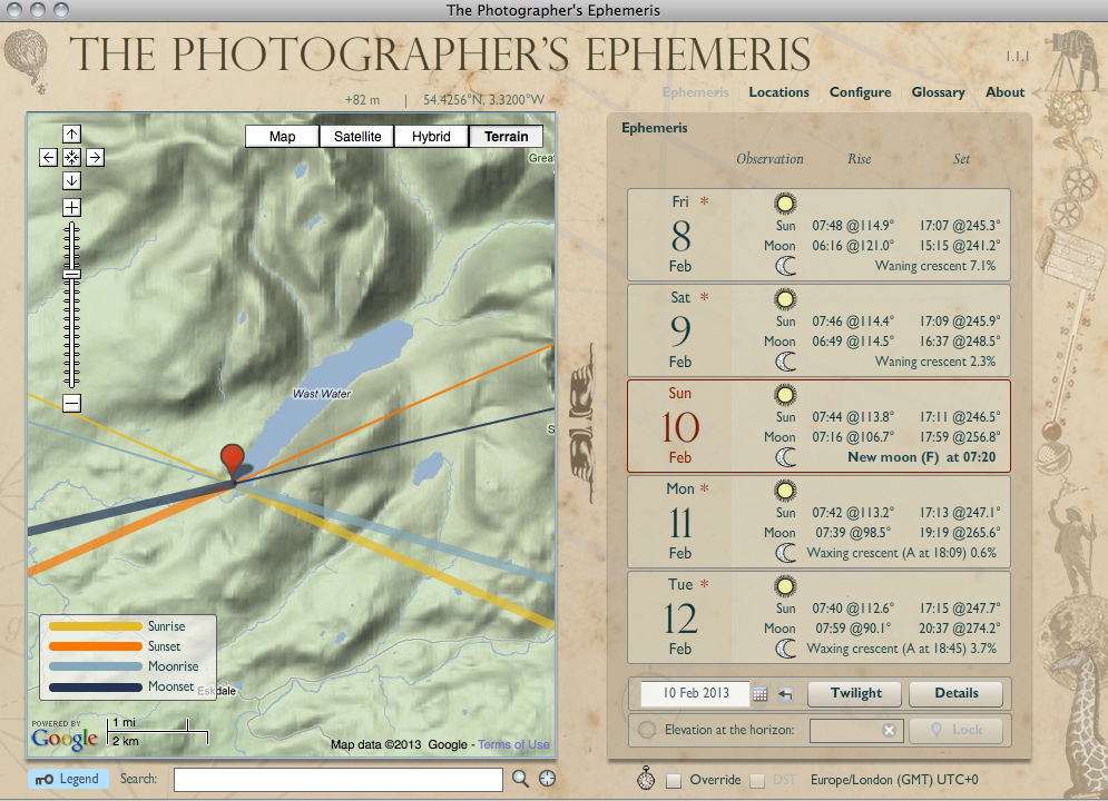Its impossible to say what the weather will be doing but I can at least confidently predict where and when the sun will rise and set on any given day. There are many ‘apps’ which provide this information but the most comprehensive is The Photographers Ephemeris which can be downloaded for use on a Mac or PC, iPad, iPhone or Android device. I am the first to admit that I have not mastered everything it can do, but very simply you can search for any location throughout the world, then drop a pin on the desired position using a variety of map styles. You then select a date and it will give you sunrise, sunset, moonrise and moonset times as well as their position in the sky at these times. This is all too important and critical information for any land, sea or cityscape photographer. It’s a great way to plan ahead to make sure the light is going to be in the right place at the right time. It doesn’t guarantee a successful image but at least it improves your chances. There are some excellent tutorials on the TPE website which I must spend some time looking at, so that I can make the best use of this invaluable application.