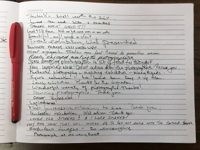 The exhibition was open for one week and whilst it was difficult to count everyone who came through the doors we together with the gallery estimated that between 800 and 1,000 people came to see our work. These numbers exceeded our expectations and apparently was higher than the average attendance for The Oxmarket. One of the great benefits was the opportunity to meet and talk to so many people who showed an interest in our photography. Another aim of the exhibition was to raise awareness about The Image Circle and judging by the feedback this objective was definitely achieved. Several pages in the visitors book were completed. Here is just one of them.