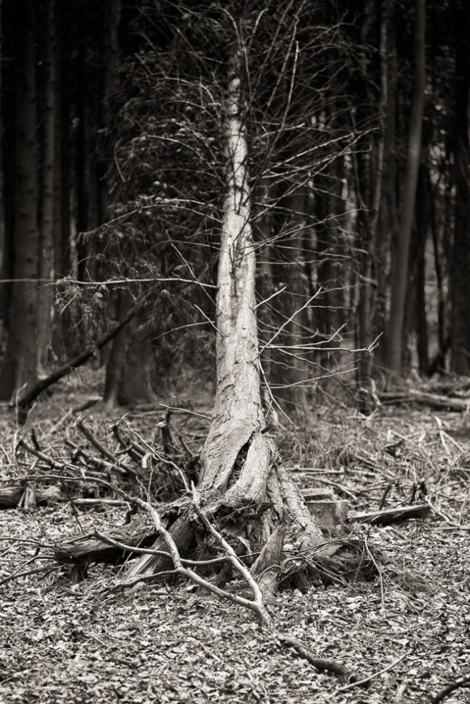 When I visited this wood recently I stayed on one of the public footpaths. I did though venture into the wood itself having noticed a single fallen pine tree which I thought might be an interesting subject to photograph. This tree had not been felled by a forester. From the angle of its trunk it was clear nature had been the cause of its downfall. I took a number of frames from different positions using either a 90mm short telephoto lens to compress the detail or an 18mm super wideangle to get up close and personal.