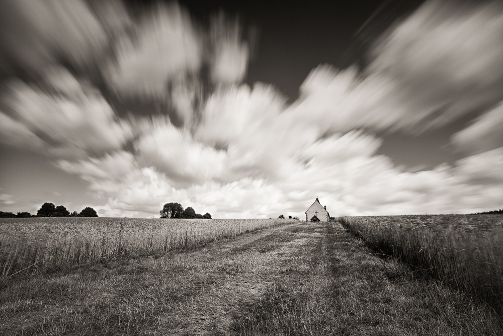 After a while I moved further away and took the shot below looking back at church on the horizon. I used the wide grass path and corn fields on either side as a lead in line. All the pictures were captured with an Zeiss 18mm lens and Lee Big Stopper.