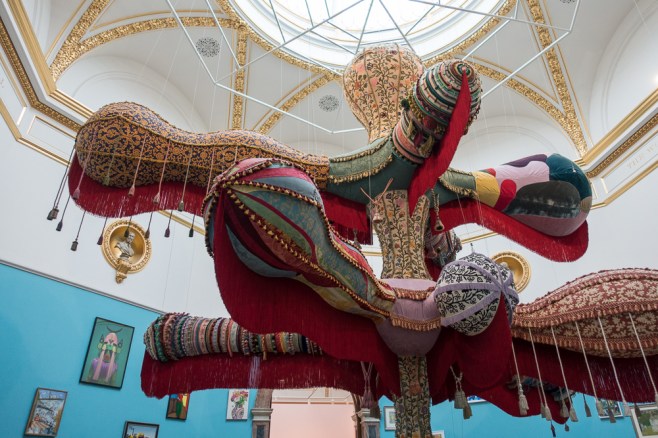 In the Wohl Central Hall a huge artwork by Joana Vasconcelos dominates the space. The piece called ‘Royal Valkyrie’ is described in the catalogue – handmade woollen crochet, felt appliqués, fabrics, ornaments, inflatable, power supply unit and steel cables. It was made over a five-year period between 2012 and 2017.