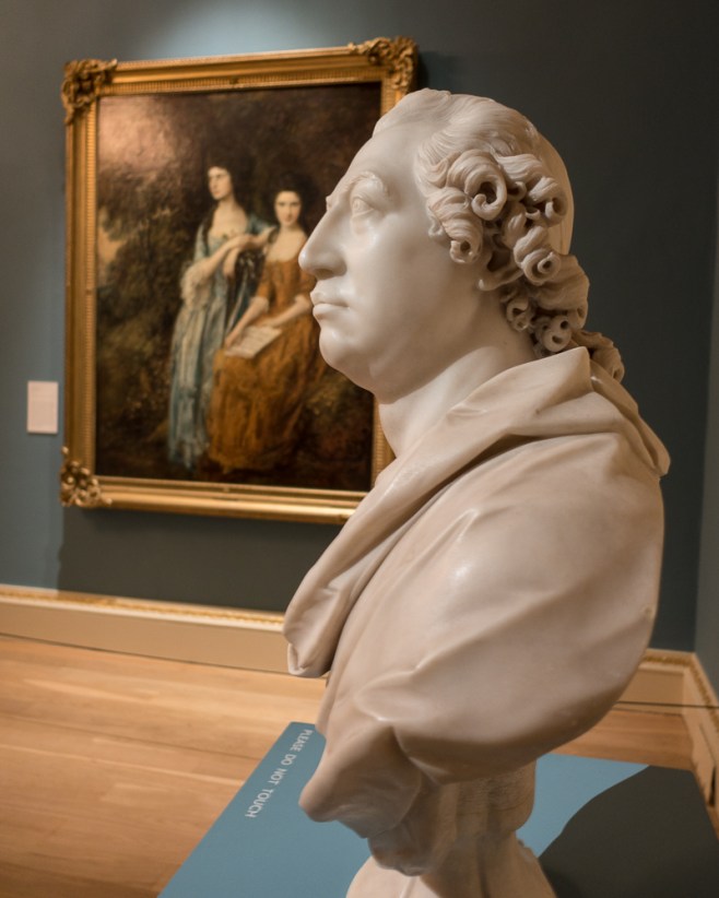 In the next room is a marble bust of King George III made in 1773 by Agostino Carlini RA. It was King George III who founded the Royal Academy when he signed a document known as the Instrument of the Foundation in December 1768. It was presented to him by a group of painters, sculptors and architects and they were known as Academicians. In the background hangs a painting by Thomas Gainsborough RA of Elizabeth and Mary Linley c 1772.