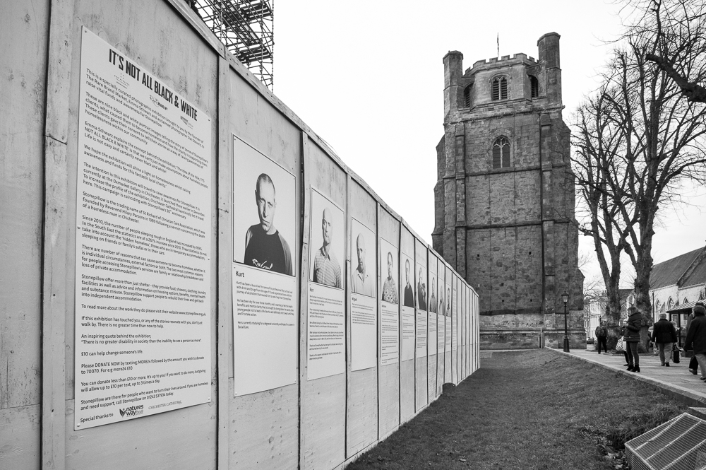 The concept behind the exhibition and the title – It’s Not All Black & White is that you can’t just make assumptions about homeless people. The message is a strong but simple one – Life is not easy and certainly never black and white! Sadly since 2010, the number people sleeping rough in England has increased by 169%. In the South East there has been a 261% increase over the same period.