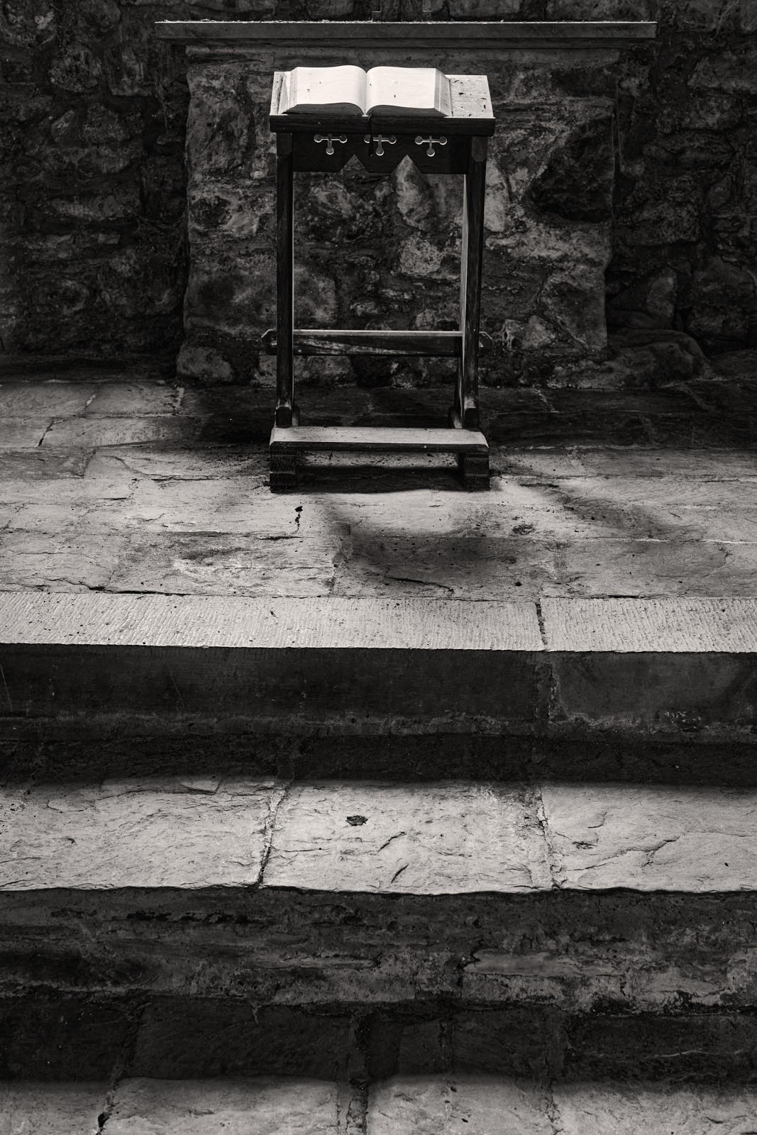 Moving back, the prayer stand itself is revealed, as well as the uneven stone floor and steps. An altar top is just visible. The light falls on the prayer book and a faint shadow of the stand on the floor suggests a window opening above.
