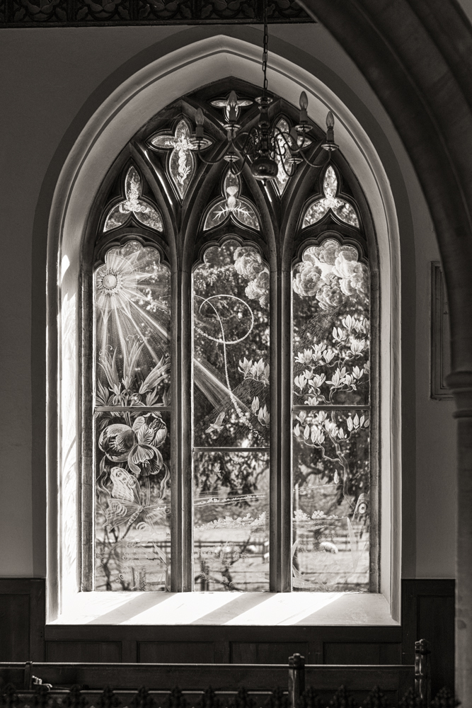 Parts of the church and the original stained glass windows were all destroyed by a German bomber in 1940. It took ten years to rebuild the church and the windows were originally replaced with green glass. The parishioners of this tiny village didn’t warm to this new look and the architect overseeing the work suggested consulting Laurence Whistler, a renowned glass engraver as well as a poet and writer. As a result he was commissioned to redesign the windows.